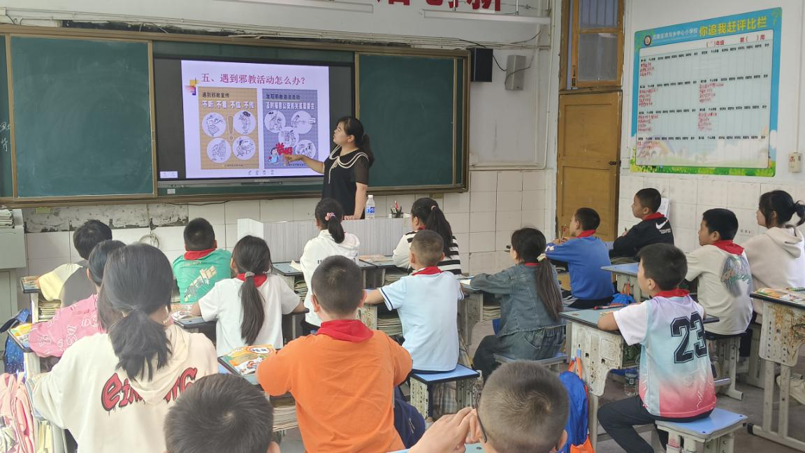 全区各学校结合实际,通过张贴反邪教宣传海报、利用LED屏播放反邪教宣传标语、展出反邪教知识展板,以及通过国旗下讲话、主题班会等形式开展反邪教知识宣讲,通过qq群、微信群、学校官网、公众号推送反邪教知识等形式,广泛宣传、宣讲、推送反邪教知识。