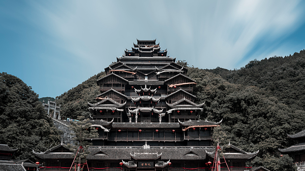 一早,重庆市彭水苗族土家族自治县蚩尤九黎城景区“开城门”,身着苗服、佩戴银饰的苗族姑娘歌声嘹亮。
